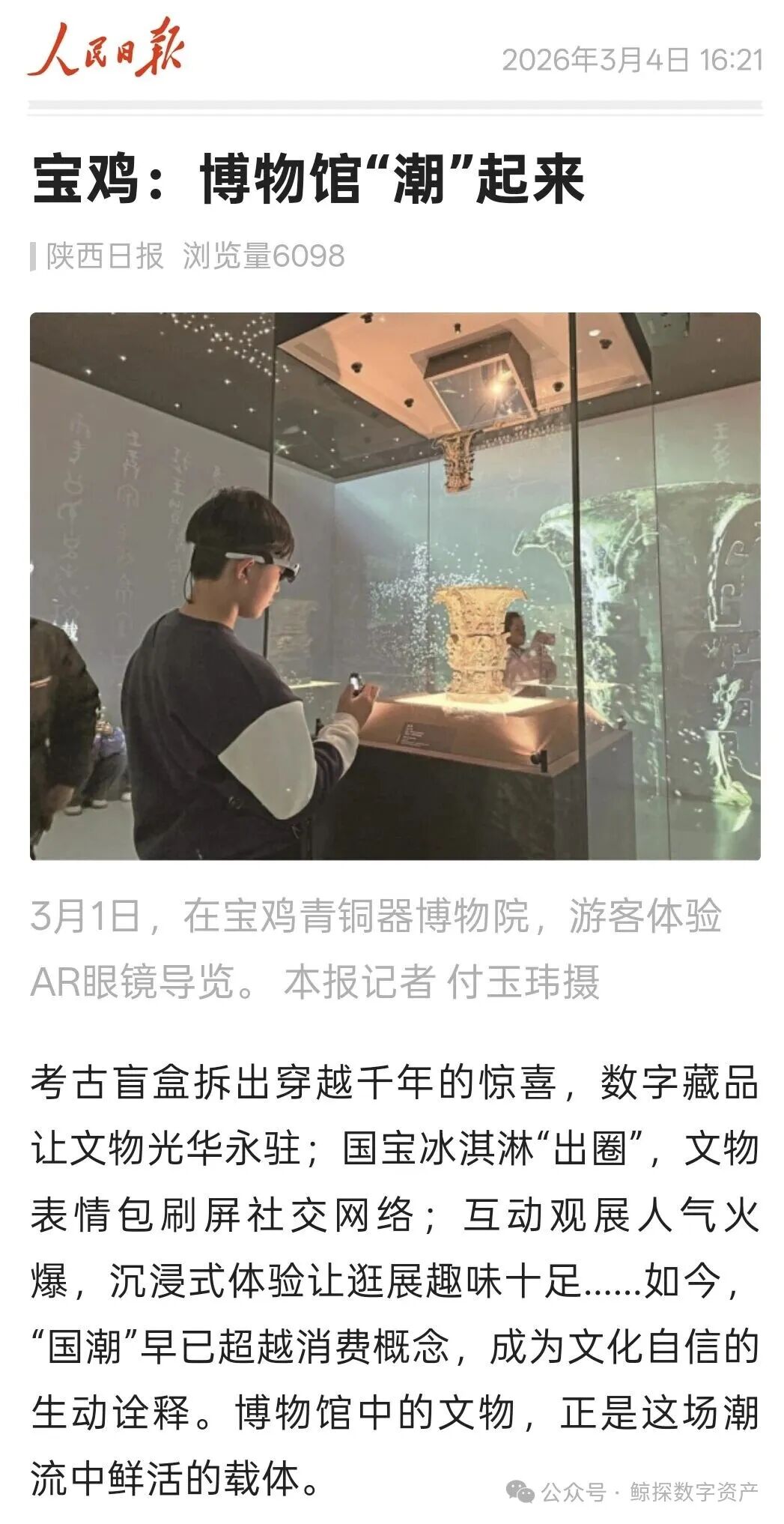 3月4日,人民日报客户端转载了宝鸡日报的一篇报道,标题叫《宝鸡:博物馆“潮”起来》。报道的主角是宝鸡青铜器博物院,一个近年来因为科技和文创频频出圈的文博机构。文章开头强调:数字藏品让文物光华永驻。在很多人印象里,青铜器展总是厚重、遥远,但这家博物院正尝试让那些三千年前的器物变得可触可感,甚至走进人们的日常生活。
